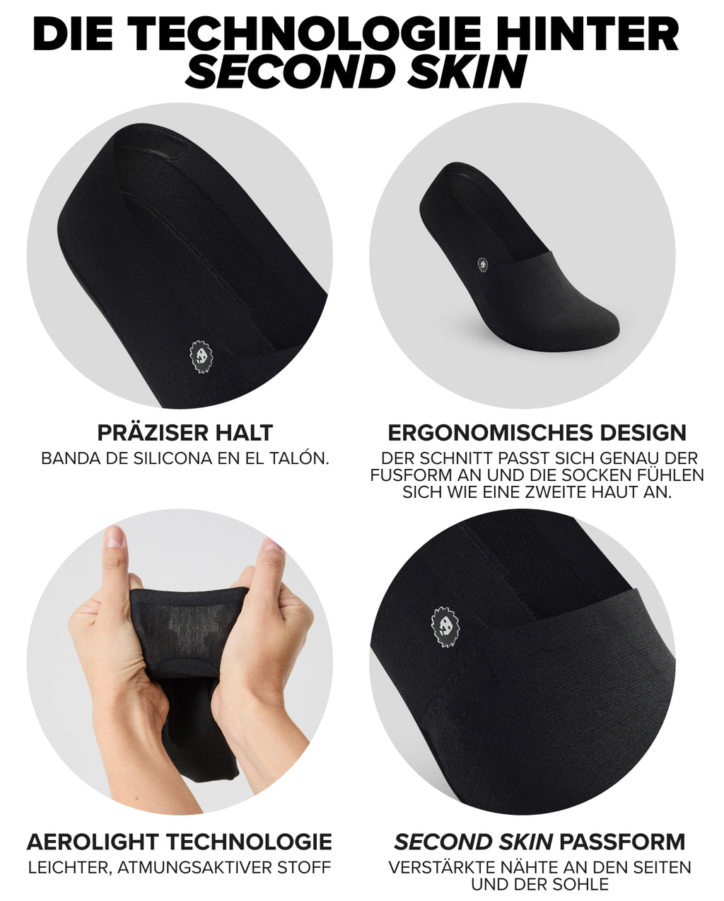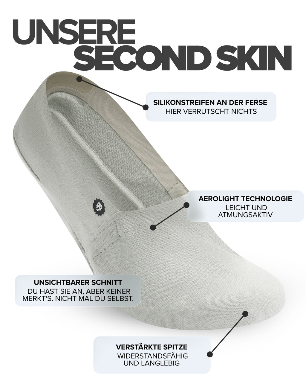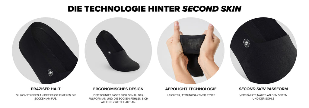 Mit Silikonstreifen, die wirklich funktionieren, atmungsaktivem Aerolight-Stoff und einem Schnitt, der sich genau der Fußform anpasst. Anziehen & vergessen.